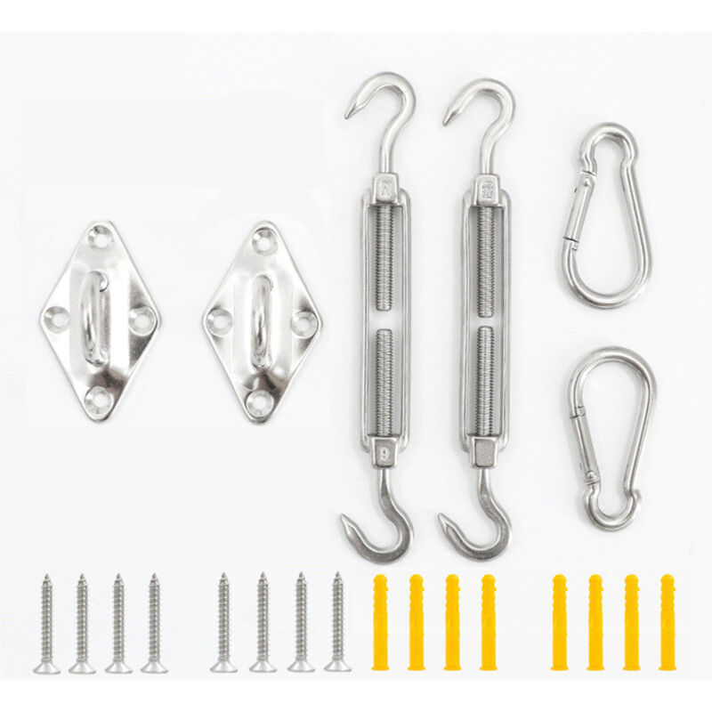 Description: Material:Stainless Steel Size:the Tensioner Length 12.5cm(4.92inch) the Diamond Buckle Length about 6*3.6cm(2.36*1.42inch) the Spring Hook about 5cm(1.97inch) the Screw Length about 2.5cm(0.98inch) Color:Show in Picture Package Includes: Total 22 PCS(Snap Hook *2pcs+Pad Eye *2pcs+Screw *16pcs+Hook Turnbuckle *2pcs) Usage: Turnbuckle- A device for adjusting the tension or length of ropes, cables, tie rods, and other tension systems. Snap Hook- A metal loop with a spring-loaded gate, used to quickly and reversibly connect components. Pad Eye- A flat metal plate with a projecting loop or ring, made all in one piece, providing an attachment point. It is secured by screwing, bolting, or welding it in place. Having the proper hardware makes installation so much easier compared to piecing it together yourself.