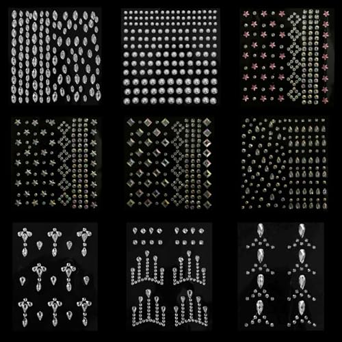 ❤ 【Strass Adesivi per Viso】 - 9 fogli di glitter adesivi strass con un massimo di 2300 strass in varie forme. Tra cui rotondi, stelle, lune, gocce d'acqua, perle, ecc., Perfetto per viso, occhi, trucco delle unghie, decorazioni artigianali e gioielli fai da te.