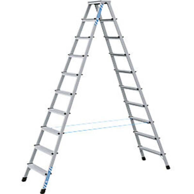 Scala a gradini professionale, anodizzata, salita su ambo i lati, 2 x 10 gradini. Fornitura = montato. Salita = su due lati. Versione da salita = gradini. Numero gradini = 2x10 pz. Materiale telaio = alluminio. Materiale gradini = alluminio con rivestimento antisdrucciolo. Profondità gradini = 80 mm. Peso = 15.8 kg. Caratteristiche = pieghevole. Portata = 150 kg. Altezza verticale = 2490 mm. Fissaggio dei gradini ai montanti con rivettatura tripla. Montanti e gradini in profilati estrusi di alluminio. Sicurezza antidivaricamento grazie a cinghie in perlon ad alta resistenza. Assemblaggio dei gradini ai montanti con rivettatura multipla. Tappi in plastica alle estremità. Profondità gradini 80 mm. Ideale per l'uso quotidiano.