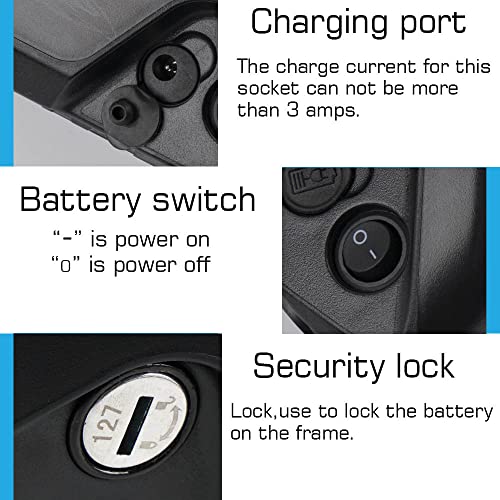 【Caratteristiche principali】 lucchetto con chiavi blocca in modo sicuro il supporto sul telaio della bicicletta, prevenendo il furto della batteria.// Con il pulsante di accensione/spegnimento, risparmia più energia.// Indicatore di alimentazione a LED della batteria illuminato, informa di caricare la batteria in tempo.// Ogni confezione è stata sottoposta a un test di carica e scarica completa in produzione, assicurati di ottenere ogni ora di ampere per cui hai pagato.
