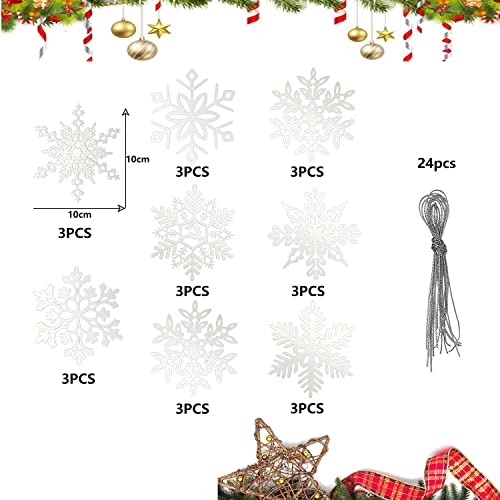 24pcs Pendente Fiocchi di Neve Natale, Fiocchi di Neve Decorativi Natale, Fiocco di Neve Plastica, Adatto per la Decorazione Dell'Albero di Natale, con Cordino, 10cm, Bianca