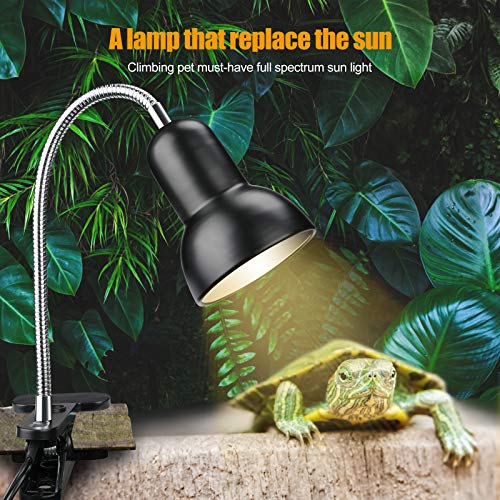2. 2 lampadine di sostituzione: 25 W/50 W, 2 lampadine per rettili adottano un processo di placcatura per garantire anti-ossidazione e antideflagrante, e un tubo in vetro sottovuoto per prolungare la durata di vita della lampada. Luce UV-A per il loro metabolismo, regolazione dell'umore, allevamento. La luce UV-B può produrre vitamina D3 di cui le ossa e gli altri organi hanno bisogno.