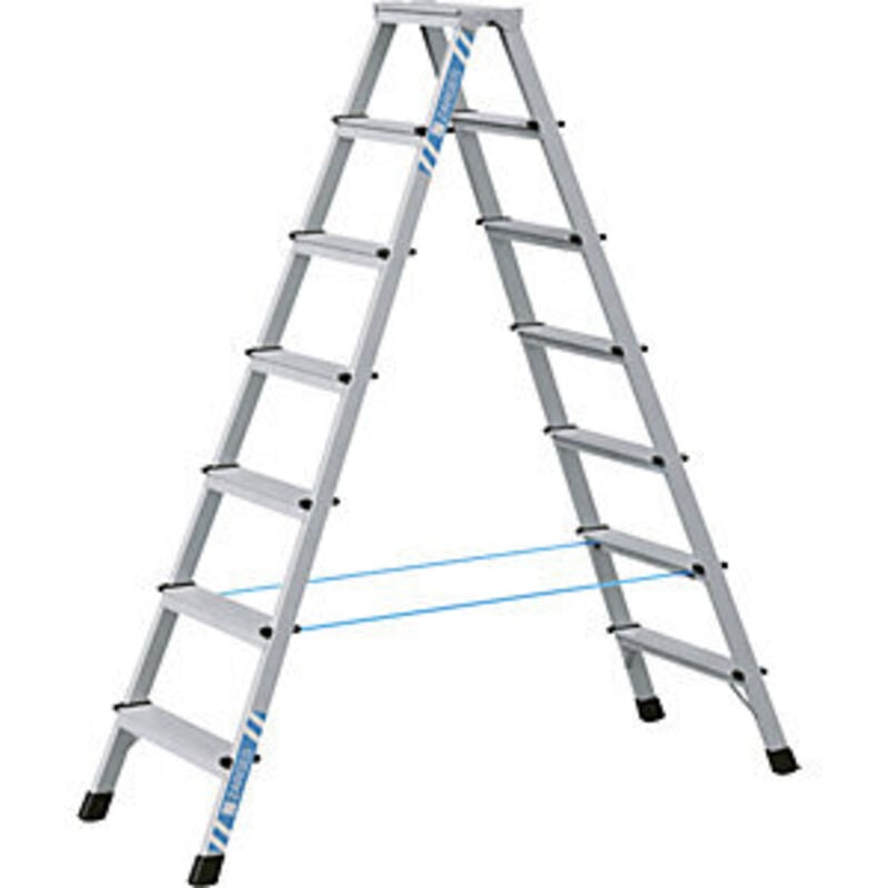 Scala a gradini professionale, anodizzata, salita su ambo i lati, 2 x 7 gradini. Fornitura = montato. Salita = su due lati. Versione da salita = gradini. Numero gradini = 2x7 pz. Materiale telaio = alluminio. Materiale gradini = alluminio con rivestimento antisdrucciolo. Profondità gradini = 80 mm. Peso = 8.3 kg. Caratteristiche = pieghevole. Portata = 150 kg. Altezza verticale = 1740 mm. Fissaggio dei gradini ai montanti con rivettatura tripla. Montanti e gradini in profilati estrusi di alluminio. Sicurezza antidivaricamento grazie a cinghie in perlon ad alta resistenza. Assemblaggio dei gradini ai montanti con rivettatura multipla. Tappi in plastica alle estremità. Profondità gradini 80 mm. Ideale per l'uso quotidiano.