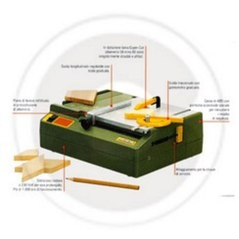 SEGA CIRCOLARE DA BANCO 220 MINI PROXXON 27006 Per tagli perfettamente diritti su legno, metalli non ferrosi, materie plastiche e fibra di vetro. Volt.220. Monofase. Con la lama Super Cut in dotazione (diametro mm.58) si possono eseguire tagli su legno dolce fino a 8 mm. Motore testato VDE a 220-240 Volt (85 watt). Silenzioso e con una vita di oltre 1000 ore di funzionamento. Capacita' di taglio su legno dolce fino a mm.8, materie plastiche (anche lastre di PERTINAX) fino a 3 mm circa, metalli non ferrosi fino a mm.1,5. Persino lastre rinforzate in fibra di vetro possono essere tagliate con lame con denti riportati in metallo duro (HM). Porticina scorrevole laterale per la rimozione della segatura. Dimensioni mm.240x180x80 circa. Importante: trasmissione della potenza tramite cinghia dentata (in stabile cassa ingranaggi montati su cuscinetti a sfere) assicura un'ottimale numero di giri della lama (circa 5000 al minuto) con coppia raddoppiata e sopratutto con sufficiente altezza di