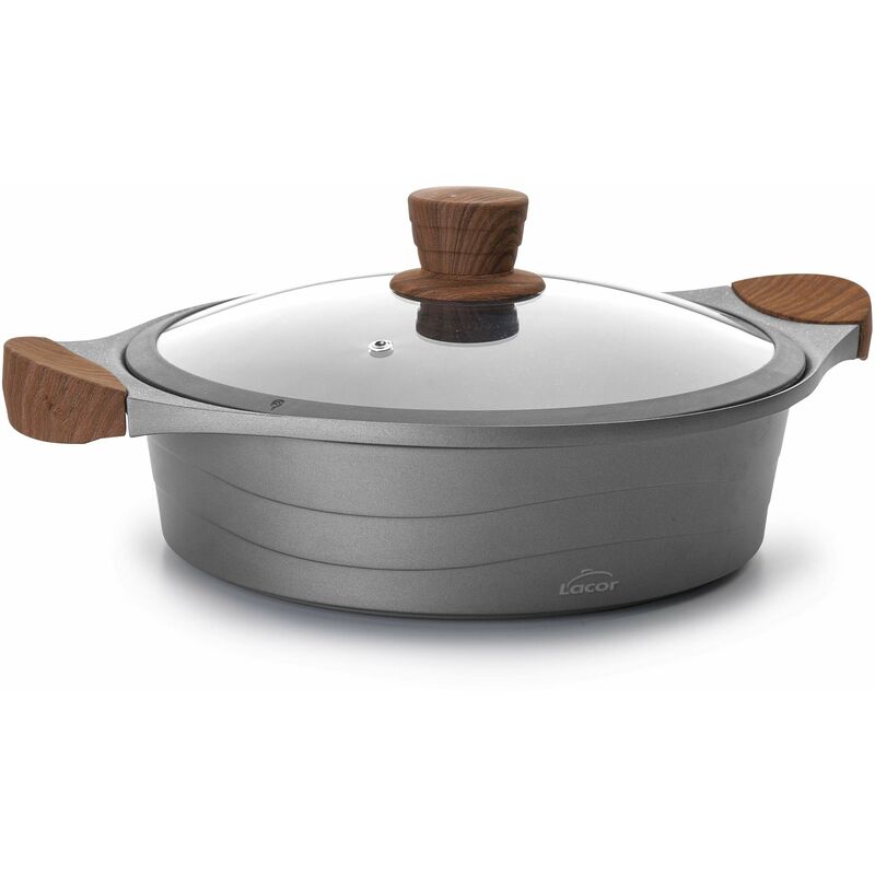 Realizzata in alluminio pressofuso di alta solidità Adatta per ogni tipo di cottura, inclusa l' induzione Rivestimento ecologico con particelle di pietra libere di PFOA di alta qualità e Hiper resistente ai graffi Pomello e manico soft touch e coperchio di vetro con chiusura in silicone Costruita in una sola pieza
