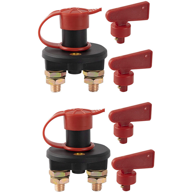 ALTA QUALITÀ - Realizzato in rame e plastica durevoli, impermeabile e resistente alla corrosione, buona conduttività elettrica e lunga durata. Scollegare il circuito in tempo per prevenire perdite e perdite, causando perdite della batteria e prolungando la batteria durata. Tensione nominale massima dell'interruttore della batteria: 60 V, corrente: 250-400 A, larghezza dell'interruttore della batteria principale: 105 mm, altezza del pulsante non raggiunta: 7 mm, connessione filettata M8. Utilizzare il pulsante di accensione/spegnimento per scollegare e ricollegare la batteria. Una copertura impermeabile protegge il buco della serratura dalla polvere. 2 interruttori della batteria, 4 pulsanti e 2 coperture impermeabili. È ideale per auto, camper, auto, auto d'epoca, roulotte e barche, nonché per la protezione dei veicoli.