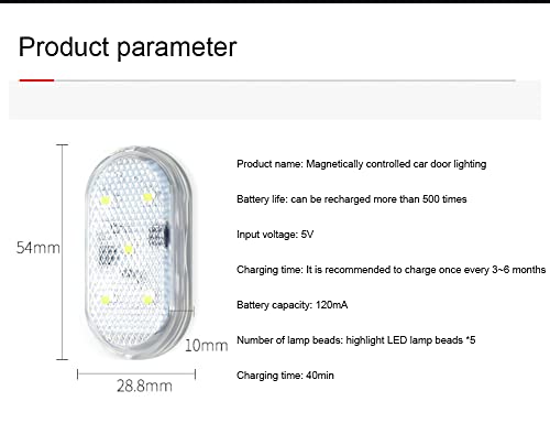 Luci della porta: luci magnetiche della porta di induzione quando si apre la porta, 5 LED ad alta luminosità e illuminazione magnetron. Ricarica USB, durata della batteria a lunga durata, batteria integrata di grande capacità, lunga durata in standby. Incollare l'uso di installazione non distruttiva, progettazione conveniente dell'installazione.
