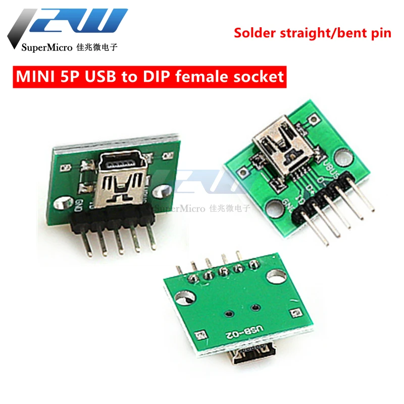 2pcs MINI 5P USB adapter DIP female socket solder pin, straight plug adapter board Welded mobile phone power data line module