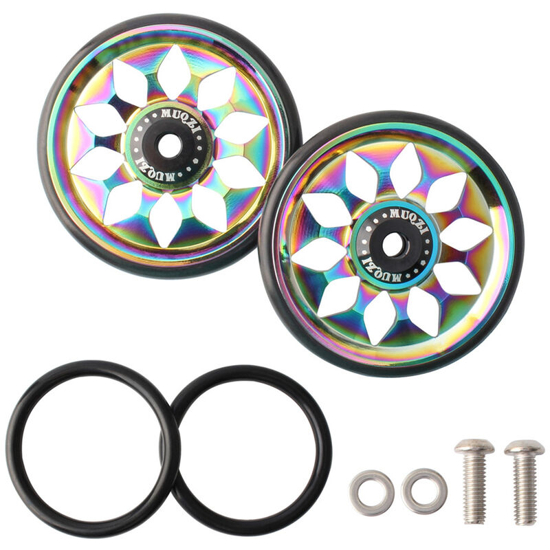 Caratteristiche: Realizzato in materiale in lega di alluminio ad alta intensita, solido e leggero. Struttura del cuscinetto a sfere piu fluida, per una migliore durata e un rotolamento piu fluido. Utilizzo di o-ring di tipo piatto con superficie di contatto maggiore per una maggiore stabilita Facile da installare con vite M6, viene fornito con anello in gomma piatto per una migliore protezione dall'usura. Ottimo sostituto per bici pieghevole brompton, non influisce sulla normale guida. Specifiche: Materiale: lega di alluminio Colore: rosso / verde / dorato / blu / nero / colorato (opzionale) Dimensione articolo: 64 * 8,6 mm / 2,5 * 0,3 pollici Peso dell'articolo: 29 g / 1 oz Elenco dei pacchetti: 1 * Coppia di ruote facili per portabici 1 * Coppia di viti e dadi 2 * Coppia di anelli di gomma
