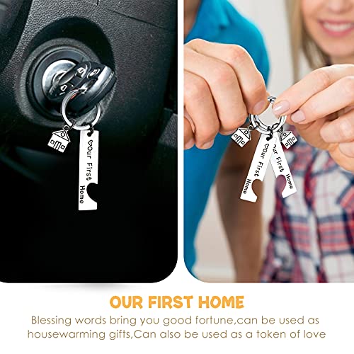 DESIGN CREATIVO: questo portachiavi in acciaio inossidabile è inciso con lettere ?la nostra prima casa?. Due stringhe di portachiavi possono essere combinate insieme per formare una forma di cuore. C'è anche un piccolo accessorio per la casa. Il design è nuovo e unico.