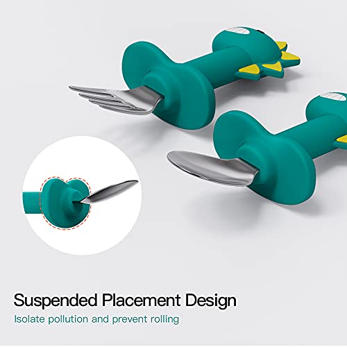 2PCS Posate Svezzamento, WitBicg Forchetta Bambini, Posate Bambini Acciaio Carota Cucchiaino Svezzamento Pappa Neonato Svezzamento, Aumentare l'Appetito,Utilizzare dopo 1 anno(Dinosauro Verde Corto)