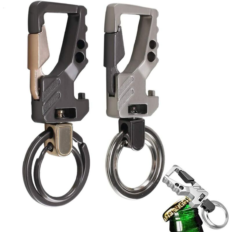 Taglia adatta: Portachiavi: Anelli portachiavi 8,5x2,4 cm: piccolo è 0,83 pollici, grande è un pollice, 2 pezzi in totale, si adatta a chiavi grandi, ad esempio: chiavi della macchina Design flessibile: Portachiavi da uomo con due anelli, chiavi di casa e lavoro facilmente distinguibili, moschettone, facile da appendere alla cintura o alla borsa Robusto e durevole: realizzato in lega di zinco, durevole, antigraffio e nessun rischio di ruggine, non facile da rompere, il portachiavi dell'auto può supportare un gran numero di chiavi Aspetto alla moda: due colori nero e argento, stile moschettone tattico, in linea con il temperamento maschile, forte trama metallica del portachiavi apribottiglie originale