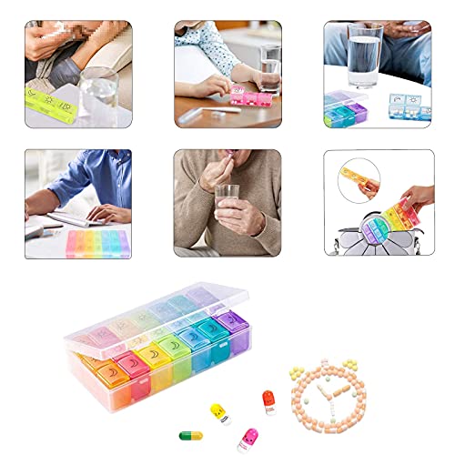 La confezione contiene: Riceverai 2 portapillole rimovibili, uno è un piccolo portapillole a colori da 7 giorni con 21 scomparti e l'altro è un piccolo portapillole nero con 7 scomparti e 7 giorni, che è molto adatto per le persone impegnate, gli anziani e i bambini. La scatola dei medicinali è ideale anche per riporre piccoli gioielli, come orecchini, perline e accessori per unghie.