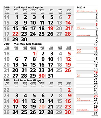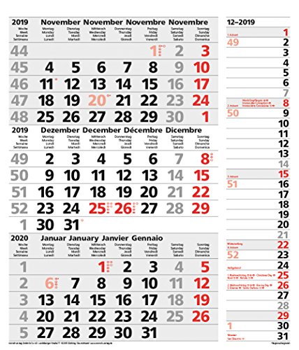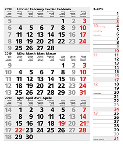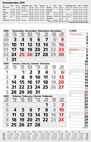 3-Monats-Planer Combi Grau 2019: Vor- und Nachmonat, mit Datumsschieber und Ferienterminen