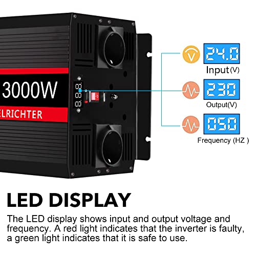 3000W Power Inverter Onda Sinusoidale Pura Convertitore DC 24V in AC 220v con Telecomando Senza Fili, Display LED-2 EU Presa con Uscita USB per RV Truck Car Camping