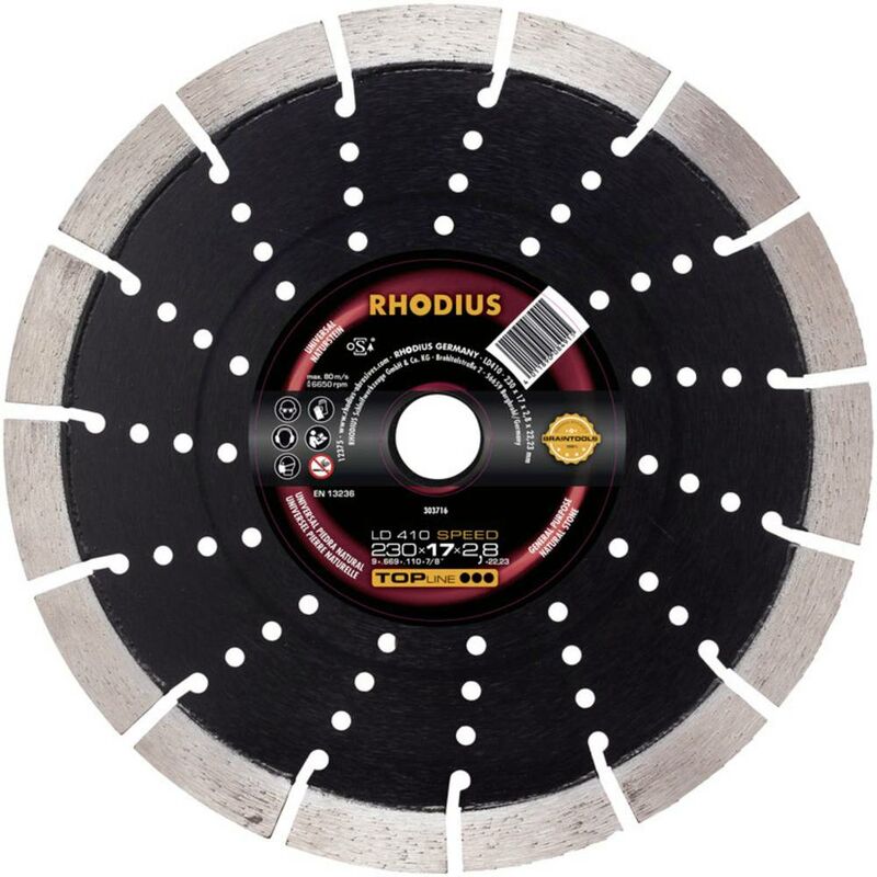 Dettagli tecnici Dimensione, Ø 115 mm Dimensioni (Ø x A) 115 mm x 13 mm Dimensioni prodotto Altezza 13 mm Idoneità del materiale Pietra naturale Peso 0.150 kg Spessore 2.4 mm Tipo prodotto Disco diamantato Ø foro 22.23 mm Mola in diamante LD410 SPEED 115 x 13,0 x 2,4 x 22,23 mm LD410 raggiunge velocità con 17 mm di altezza segmenti di diamante una lunga durata in materiali di granito fino a calcestruzzo. Con l'LD410 SPEED può essere particolarmente comodo, in quanto le vibrazioni sono state gli segmenti ridotto al minimo. L'anima in acciaio è inoltre dotato di raffreddamento aperture di ventilazione. È particolarmente per attrezzi manuali smerigliatrice angolare, sega da tavolo e benzina di separazione. Laser saldato. Per taglio a umido e a secco. Testo tradotto automaticamente. Punti di forza e dettagli Extra lunga durata fino a un massimo di 17mm di altezza, segmenti forgiati Per attrezzi manuali smerigliatrice angolare, benzina e separatore seghe da tavolo Nucleo in acciaio