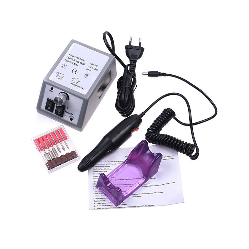 Tensione nominale di uscita: DC0 ~ 18VTempo di rotazione dell'innesto di sicurezza: 10SecDurata continua: >300HVelocità variabile: 0-35,000 RPMVita intermittente: >400HController per trapano elettrico per unghie 1 x1 x manipolo per trapano per unghie1 x supporto in silicone violaControllo della potenza del pedale 1 xPunte per molatura in metallo 6 x6 x fasce di Smeriglitatura1 x manuale utenteSpecifiche per20000 Set (grigio)Motore principale Parametri di ParteTensione nominale (V) AC 110 - 240Tensione di uscita DC 0 - 17VCorrente di uscita 1 UNPotenza di uscita 12WManiglia Parametri di ParteVelocità fino a 20000 giri/min1 x controller per trapano per unghie1 x Macchina ManipoloPunte per unghie 6 x con fasce abrasive 6 x1 x Manipolo Stand1 x Manuale Inglese