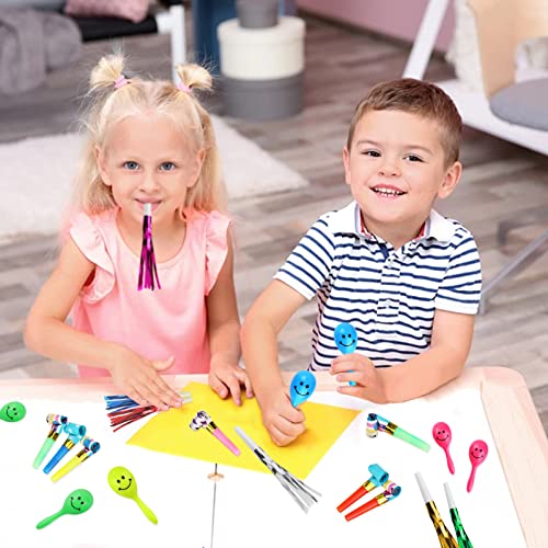 36PCS, set di 3 tipi di rumori per feste, soffiatori di carta divertenti, soffiatori di metallo con frange glitterate, agitatori per mani con musica al neon mini, forniture per bomboniere per bambini