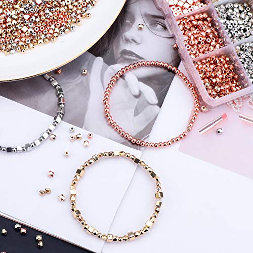 Quantità abbondante: il set di perline assortite Guaksxi contiene 1200 perline rotonde da 4 mm, 690 ciondoli quadrati da 4 mm, 900 perline distanziali per colonne, 1050 perline cubiche, 3840 perline per gioielli in totale. Quantità e stili sufficienti per la creazione di gioielli.