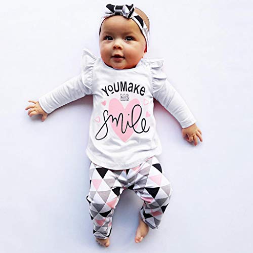3pcs Completini, Neonata Maniche Lunghe Tops, Lettera Camicia Cime + Geometrica Pantaloni + Fascia Bambina Abiti Set (Bianco, 3 Mesi)
