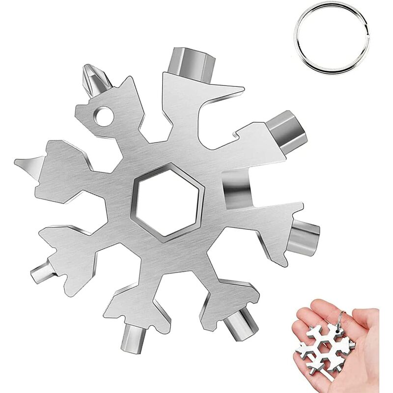 Materiale di alta qualità - Il set di chiavi è realizzato in acciaio inossidabile di alta qualità, con superficie lucida, resistenza alla corrosione, non facile da arrugginire e durevole. Chiave per cacciavite multifunzione, adatta a tutti i tipi di lavori di manutenzione complicata. 【Multiutensile 18 in 1】Ti offre 18 strumenti straordinari per le tue diverse esigenze. Possono essere usati come portachiavi, apribottiglie, piccoli cacciaviti Phillips, cacciaviti a testa piatta, chiavi esagonali, ecc. 【Compatto e leggero】 Design unico a fiocco di neve e aspetto bellissimo. Con un diametro di 6,4 cm, è piccolo e comodo, con un portachiavi per un facile trasporto. Adatto a tutte le occasioni indoor e outdoor. 【Forma del fiocco di neve】 Il design unico della forma del fiocco di neve lo rende perfettamente combinato con funzionalità e design nel nostro strumento multifunzionale compatto. Con portachiavi, facile da trasportare o utilizzato come decorazione per alberi di Natale. 【Ampiamente