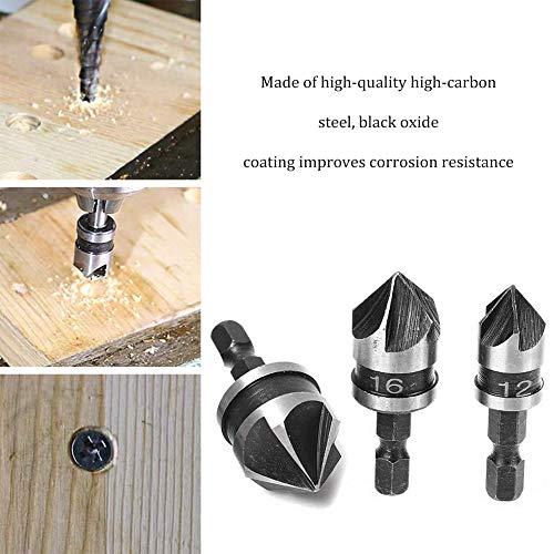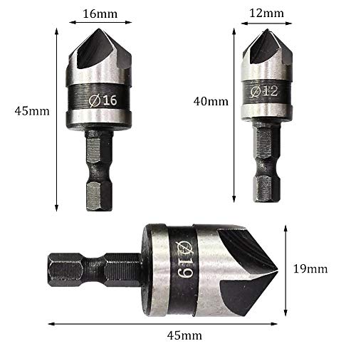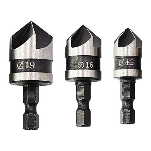 3pcs Punte per Svasatore 1/4 Svasatore Punta da Trapano 5 Flauti Codolo Esagonale Titanio Set Taglierina Smusso per Legno, Metallo, Cambio Rapido Punte(12 mm 16 mm 19 mm)