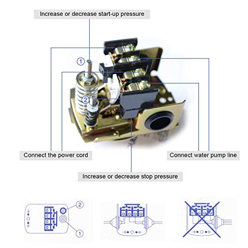 【Controllo Automatico】 2 molle per regolare la soglia di pressione, facile da regolare e precisa. Il pressostato della pompa attiva automaticamente la pompa quando la pressione è inferiore alla soglia impostata dell'interruttore e arresta automaticamente la pompa quando la pressione è superiore alla soglia impostata.