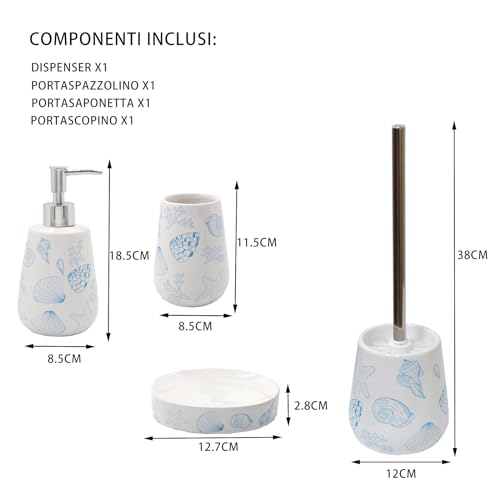 BM 4072 Set di Accessori da Bagno in Ceramica Bianco Blu Decorato Motivo Conchiglie Stelle Marine, Blu, Set Accessori Bagno Completo 4 Pezzi, Dispenser, Portaspazzolino, Portasaponetta, Portascopino