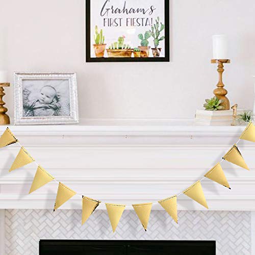 CONFEZIONI DEL PACCHETTO - 4 set di stendardi triangolari dorati a doppia faccia, ogni stringa è di 3 metri con 26 bandiere triangolari, quindi il totale è 12 metri = 40 piedi e 104 pezzi bandiere. Dimensioni di ogni bandiera: 14 cm x 9 cm / 5,5 "x 3,5" (L x L).