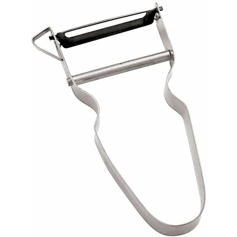 Pelapatate ad archetto Paderno perfetto per sbucciare tuberi, frutta e verdura crudi come patate, carote, zucchine, cetrioli, ravanelli bianchi e mele. La lama mobile si adatta facilmente alla superficie da tagliare e consente di seguire in modo più accurato i contorni degli alimenti. Il taglio ampio evita che le bucce rimangano incastrate. La punta sull'estremità è utile per eliminare eventuali germogli, occhi e difetti degli alimenti, oppure per rimuovere il torsolo della mela. Applicando una pressione minima rimuove uno strato sottile di buccia, riducendo così gli scarti. Manico ergonomico per una presa sicura, facilmente utilizzabile anche dai mancini. Materiale: acciaio inox 18/10. Dimensioni: 5 x 4 cm. UTENSILI Un' ampia gamma di utensili professionali per la cucina lavabili in lavastoviglie. Dimensioni: cm 5X4