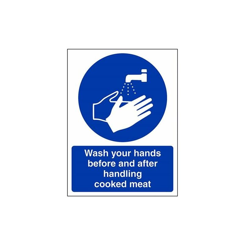 V Safety 44015AN-S - Segnale obbligatorio per catering, autoadesivo, per lavarsi le mani prima e dopo la manipolazione di carne cotta, ritratto, 150 mm x 200 mm, blu 150mm x 200mm
