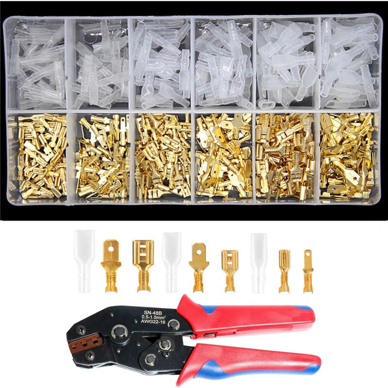 Caratteristiche: Realizzato in rame rosso stagnato di alta qualità, la sua superficie è stagnata per garantire una buona conduttività e resistenza alla corrosione. Il manicotto isolante è realizzato in nylon, con elevata conduttività, resistenza all'ossidazione, durata e può essere abbinato a terminali a crimpare per un utilizzo sicuro. I connettori a forcella maschio e femmina sono disponibili in tre diverse dimensioni: 2,8 mm/4,8 mm/6,3 mm. Perfetto per 22-14 vergelle, diverse dimensioni possono soddisfare le diverse esigenze. I connettori a forcella maschio femmina sono facili da usare e ispezionare. Basta crimpare e/o saldare i fili e utilizzare una pellicola termoretraibile di alta qualità per ottenere una connessione pulita, forte e professionale. Specifiche: Materiale: metallo, plastica Colore: oro e trasparente Dimensioni: 2,8 mm, 4,8 mm, 6,3 mm Spessore: 0,5 mm Quantità: 450 pezzi Terminali a forcella femmina da 2,8 mm 50 pezzi Terminali a forcella femmina da 4,8 mm 50 pezzi