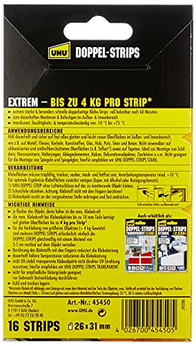 Uhu 45450 - Strisce biadesive, presa fino a 4 kg, 16 pezzi, 26 x 31 mm