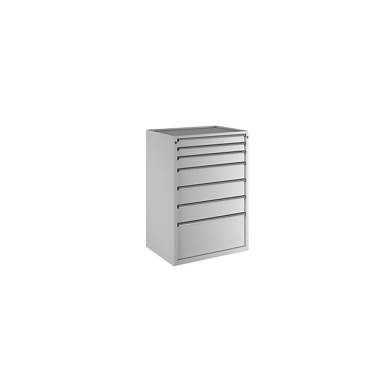 Cassettiera, largh. x prof. 910 x 675 mm, portata cassetti 200 kg, 7 cassetti, altezza 1280 mm, frontalino grigio chiaro. Fornitura = montato. Altezza = 1280 mm. Larghezza = 910 mm. Profondità = 675 mm. Portata per cassetto = 200 kg. Numero cassetti = 7 pz. Altezza cassetti = 2x90, 1x120, 3x180, 1x360 mm. Estrazione cassetti = 100%. Colore corpo = grigio chiaro RAL 7035. Colore frontalino = grigio chiaro RAL 7035. Dotazione = sicure antiribaltamento. Materiale = lamiera d'acciaio, verniciata a polvere. Versione cassetti = guida a rulli. Serratura = chiusura centralizzata a cilindro. Dimensioni interne cassetti = 750x600 mm. Caratteristiche = possibilità di applicare targhette. Portata cassetti 200 kg. Estraibili al 100%, massimo sfruttamento dello spazio. Sicurezza antiribaltamento garantita da un fermo di bloccaggio singolo. Chiusura centralizzata: serratura a cilindro con nucleo sostituibile o serratura elettronica. Robusta struttura in lamiera d'acciaio verniciata a polvere. Corpo