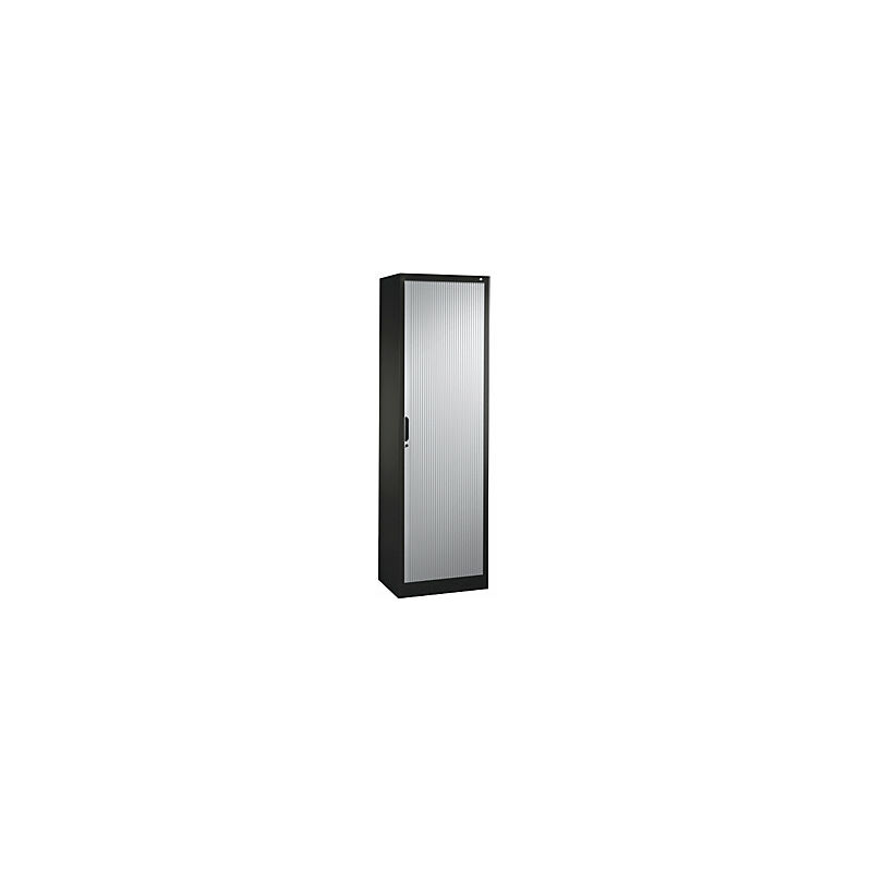 Armadio guardaroba con serranda, alt. x largh. x prof. 1980 x 600 x 420 mm, 1 ripiano, 1 asta appendiabiti, nero / grigio chiaro. Fornitura = montato. Altezza = 1980 mm. Larghezza = 600 mm. Profondità = 420 mm. Colore corpo = grigio nerastro RAL 7021. Materiale corpo = lamiera d'acciaio, verniciata a polvere. Colore serranda = grigio chiaro. Caratteristiche = con serratura. Serratura = serratura a cilindro con 2 chiavi. Materiale serranda = plastica. Dotazione interna = 1 asta appendiabiti, 1 ripiano. Numero ripiani = 1 pz. Portata per ripiano = 50 kg. Colore ripiani = grigio nerastro RAL 7021. Tipo di porta = serranda orizzontale. Passo di regolazione altezza ripiani = 15 mm. Larghezza interna = 493 mm. Altezza interna = 1836 mm. Profondità interna = 385 mm. Spessore ripiani = 24 mm. Spessore del corpo = 0.88 mm. Altezza zoccolo = 100 mm. Corpo in robusta lamiera d'acciaio spessa 0,88 mm. Verniciatura a polvere. Serranda orizzontale in plastica, con serratura. Guide di chiusura in