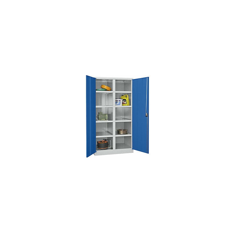 Armadio per carichi pesanti, altezza 1950 mm, 8 ripiani, grigio / blu. Fornitura = montato. Altezza = 1950 mm. Larghezza = 1040 mm. Profondità = 630 mm. Dotazione interna = 8 ripiani, parete divisoria. Materiale corpo = lamiera d'acciaio. Superficie = verniciatura a polvere. Materiale ripiani = lamiera d'acciaio, verniciata a polvere. Colore corpo = grigio chiaro RAL 7035. Colore porta = blu genziana RAL 5010. Portata per ripiano = 120 kg. Numero ripiani = 8 pz. Passo di regolazione altezza ripiani = 25 mm. Tipo di porta = anta a battente. Particolarmente robusti e indeformabili grazie alla lamiera d'acciaio molto spessa e a una speciale struttura delle sponde. Elementi di allestimento verniciati a polvere e regolabili in altezza con passo di 25 mm. Altezza armadio 1950 mm. Con parete divisoria centrale. Cassetti con listello integrato, con cuscinetti a sfera, portata di 60 kg. Per evitare un rovesciamento quando i cassetti sono estratti, è necessario un fissaggio a cura del cliente