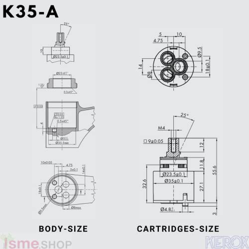 CARTUCCIA DI RICAMBIO Ceramica bassa con 2 piedini senza distributore a dischi ceramici KEROX - K35 A. Adatta per miscelatori con sede cartuccia bassa Ø 35 mm. Utilizzo: per rubinetti miscelatori mono-comando della cucina, bagno, doccia e vasca