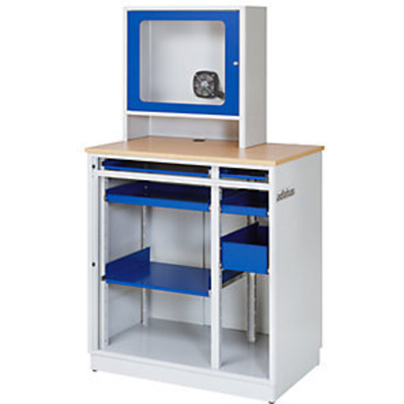 Postazione chiusa per PC, tipo W060/3, alt. x largh. x prof. 1820 x 1030 x 660 mm. Fornitura = montato. Altezza totale = 1820 mm. Larghezza totale = 1030 mm. Profondità totale = 660 mm. Dimensioni interne scomparto per schermo = 705x280x530 mm. Dimensioni max schermo (TFT) = 26 pollici. Materiale corpo = lamiera d'acciaio. Colore corpo = grigio chiaro RAL 7035. Colore frontalino = blu genziana RAL 5010, grigio chiaro RAL 7035. Dimensioni finestrella = 545x495 mm. Portata per ripiano estraibile = 20 kg. Portata per ripiano = 20 kg. Numero cassetti = 3 pz. Cablaggio = presa multipla a 7 posti. Ventilazione = ventilazione passiva (fessure di aerazione). Dotazione = ripiano estraibile per mouse. Caratteristiche = con serratura. Tipo di porta = serrande. Dotazione ruote = senza rotelle. Corpo con zoccolino e viti per la regolazione della messa in piano. Vano tastiera con serranda (con serratura), ripiano estraibile per mouse/tastiera a sinistra, ripiano estraibile per mouse a destra.
