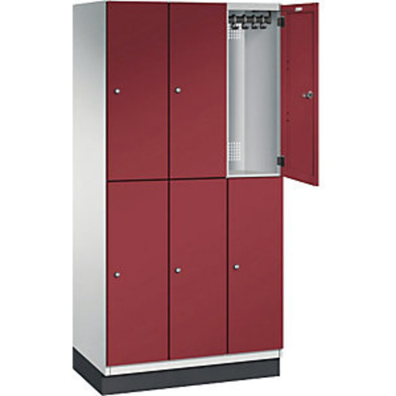 Armadio a scomparti CAMBIO con asta appendiabiti, 6 scomparti, corpo grigio chiaro / anta rosso rubino, larghezza 900 mm. Fornitura = montato. Altezza = 1950 mm. Profondità = 525 mm. Larghezza = 900 mm. Colore corpo = grigio chiaro RAL 7035. Colore porta = rosso rubino RAL 3003. Serratura = serratura a cilindro differenziata. Numero scomparti in larghezza = 3 pz. Numero scomparti = 6 pz. Larghezza scomparti = 300 mm. Materiale = lamiera d'acciaio. Altezza armadietto = 1950 mm. Dotazione interna = 1 asta appendiabiti, 4 ganci scorrevoli. Larghezza interna = 262 mm. Altezza interna = 862 mm. Profondità interna = 480 mm. Tipo di porta = anta a battente in acciaio. Numero chiavi = 2 pz. Altezza scomparti = 925 mm. Larghezza ripiani = 300 mm. Profondità ripiani = 525 mm. Altezza zoccolo = 100 mm. Struttura = con saldatura. Superficie = verniciatura. Struttura in acciaio di lunga durata con ante a battente. Cerniere in acciaio inox. Finecorsa di apertura a 90°. Corpo in materiale zincato.
