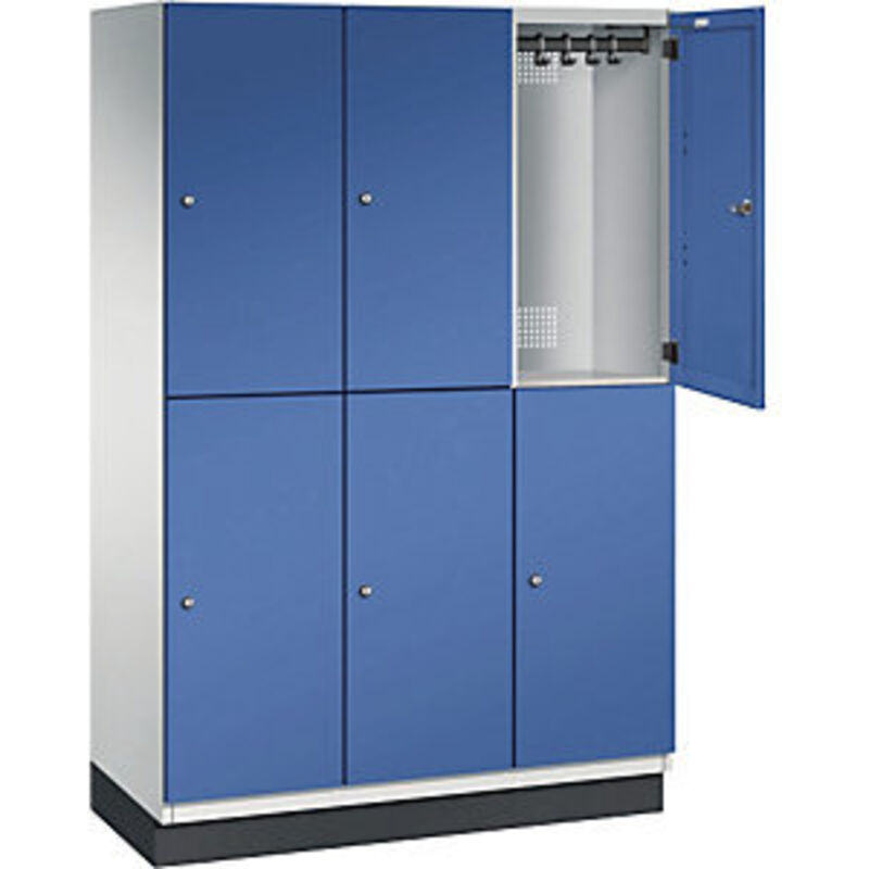 Armadio a scomparti CAMBIO con asta appendiabiti, 6 scomparti, corpo grigio chiaro / anta blu genziana, larghezza 1200 mm. Fornitura = montato. Altezza = 1950 mm. Profondità = 525 mm. Larghezza = 1200 mm. Colore corpo = grigio chiaro RAL 7035. Colore porta = blu genziana RAL 5010. Serratura = serratura a cilindro differenziata. Numero scomparti in larghezza = 3 pz. Numero scomparti = 6 pz. Larghezza scomparti = 400 mm. Materiale = lamiera d'acciaio. Altezza armadietto = 1950 mm. Dotazione interna = 1 asta appendiabiti, 4 ganci scorrevoli. Larghezza interna = 362 mm. Altezza interna = 862 mm. Profondità interna = 480 mm. Tipo di porta = anta a battente in acciaio. Numero chiavi = 2 pz. Altezza scomparti = 925 mm. Larghezza ripiani = 400 mm. Profondità ripiani = 525 mm. Altezza zoccolo = 100 mm. Struttura = con saldatura. Superficie = verniciatura. Struttura in acciaio di lunga durata con ante a battente. Cerniere in acciaio inox. Finecorsa di apertura a 90°. Corpo in materiale zincato.