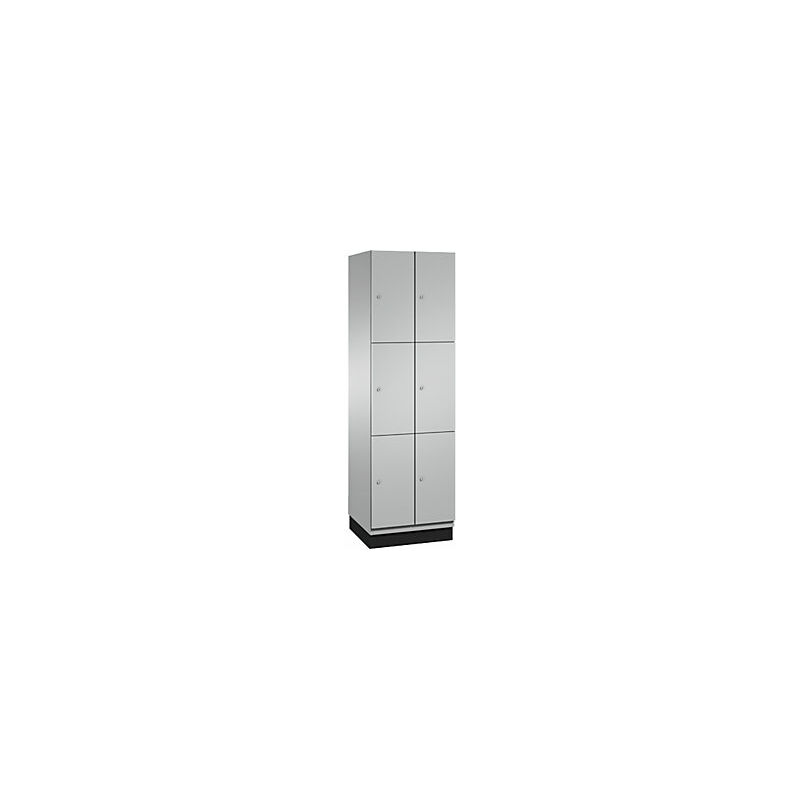 Armadietto a scomparti CAMBIO con porte in lamiera d'acciaio, 6 scomparti larghi 600 mm, corpo alluminio brillante / anta alluminio brillante. Fornitura = montato. Altezza = 1950 mm. Profondità = 525 mm. Larghezza = 600 mm. Colore corpo = alluminio brillante RAL 9006. Colore porta = alluminio brillante RAL 9006. Serratura = serratura a cilindro differenziata. Numero scomparti in larghezza = 2 pz. Numero scomparti = 6 pz. Larghezza scomparti = 300 mm. Materiale = lamiera d'acciaio. Altezza armadietto = 1950 mm. Dotazione interna = senza dotazione interna. Larghezza interna = 262 mm. Altezza interna = 562 mm. Profondità interna = 480 mm. Tipo di porta = anta in lamiera piena. Numero chiavi = 2 pz. Altezza scomparti = 616.6 mm. Larghezza ripiani = 300 mm. Profondità ripiani = 525 mm. Altezza zoccolo = 100 mm. Struttura = con saldatura. Superficie = verniciatura. Struttura in acciaio di lunga durata con ante a battente in acciaio. Cerniere in alluminio/plastica. Finecorsa di apertura a