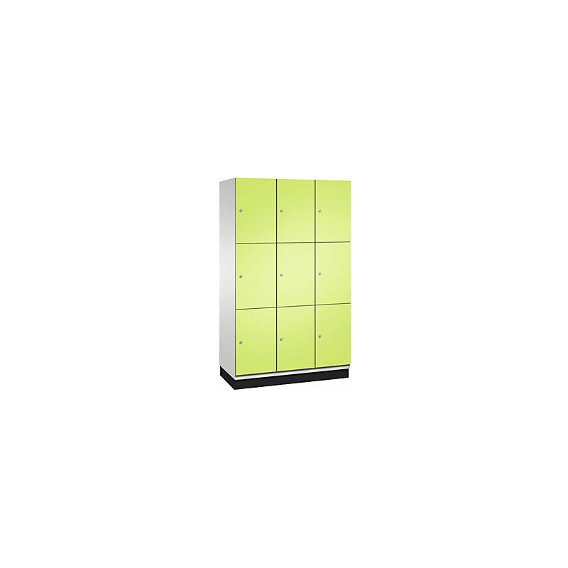 Armadietto a scomparti CAMBIO con porte in lamiera d'acciaio, 9 scomparti larghi 1200 mm, corpo grigio chiaro / anta verdino. Fornitura = montato. Altezza = 1950 mm. Profondità = 525 mm. Larghezza = 1200 mm. Colore corpo = grigio chiaro RAL 7035. Colore porta = verde azzurrognolo RDS 1108060. Serratura = serratura a cilindro differenziata. Numero scomparti in larghezza = 3 pz. Numero scomparti = 9 pz. Larghezza scomparti = 400 mm. Materiale = lamiera d'acciaio. Altezza armadietto = 1950 mm. Dotazione interna = senza dotazione interna. Larghezza interna = 362 mm. Altezza interna = 562 mm. Profondità interna = 480 mm. Tipo di porta = anta in lamiera piena. Numero chiavi = 2 pz. Altezza scomparti = 616.6 mm. Larghezza ripiani = 400 mm. Profondità ripiani = 525 mm. Altezza zoccolo = 100 mm. Struttura = con saldatura. Superficie = verniciatura. Struttura in acciaio di lunga durata con ante a battente in acciaio. Cerniere in alluminio/plastica. Finecorsa di apertura a 90°. Materiale corpo e