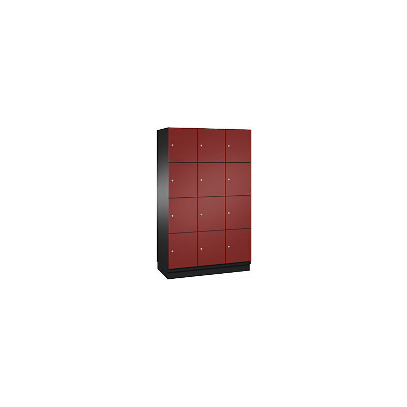 Armadietto a scomparti CAMBIO con porte in lamiera d'acciaio, 12 scomparti larghi 1200 mm, corpo grigio nerastro / anta rosso rubino, altezza scomparti 462,5 mm. Fornitura = montato. Altezza = 1950 mm. Profondità = 525 mm. Larghezza = 1200 mm. Colore corpo = grigio nerastro RAL 7021. Colore porta = rosso rubino RAL 3003. Serratura = serratura a cilindro differenziata. Numero scomparti in larghezza = 3 pz. Numero scomparti = 12 pz. Larghezza scomparti = 400 mm. Materiale = lamiera d'acciaio. Altezza armadietto = 1950 mm. Dotazione interna = senza dotazione interna. Larghezza interna = 362 mm. Altezza interna = 412 mm. Profondità interna = 480 mm. Tipo di porta = anta in lamiera piena. Numero chiavi = 2 pz. Altezza scomparti = 462.5 mm. Larghezza ripiani = 400 mm. Profondità ripiani = 525 mm. Altezza zoccolo = 100 mm. Struttura = con saldatura. Superficie = verniciatura. Struttura in acciaio di lunga durata con ante a battente in acciaio. Cerniere in alluminio/plastica. Finecorsa di