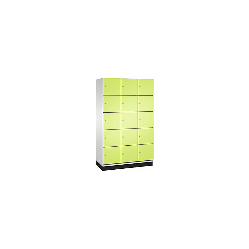Armadietto a scomparti CAMBIO con porte in lamiera d'acciaio, 15 scomparti larghi 1200 mm, corpo grigio chiaro / anta verdino. Fornitura = montato. Altezza = 1950 mm. Profondità = 525 mm. Larghezza = 1200 mm. Colore corpo = grigio chiaro RAL 7035. Colore porta = verde azzurrognolo RDS 1108060. Serratura = serratura a cilindro differenziata. Numero scomparti in larghezza = 3 pz. Numero scomparti = 15 pz. Larghezza scomparti = 400 mm. Materiale = lamiera d'acciaio. Altezza armadietto = 1950 mm. Dotazione interna = senza dotazione interna. Larghezza interna = 362 mm. Altezza interna = 322 mm. Profondità interna = 480 mm. Tipo di porta = anta in lamiera piena. Numero chiavi = 2 pz. Altezza scomparti = 370 mm. Larghezza ripiani = 400 mm. Profondità ripiani = 525 mm. Altezza zoccolo = 100 mm. Struttura = con saldatura. Superficie = verniciatura. Struttura in acciaio di lunga durata con ante a battente in acciaio. Cerniere in alluminio/plastica. Finecorsa di apertura a 90°. Materiale corpo e