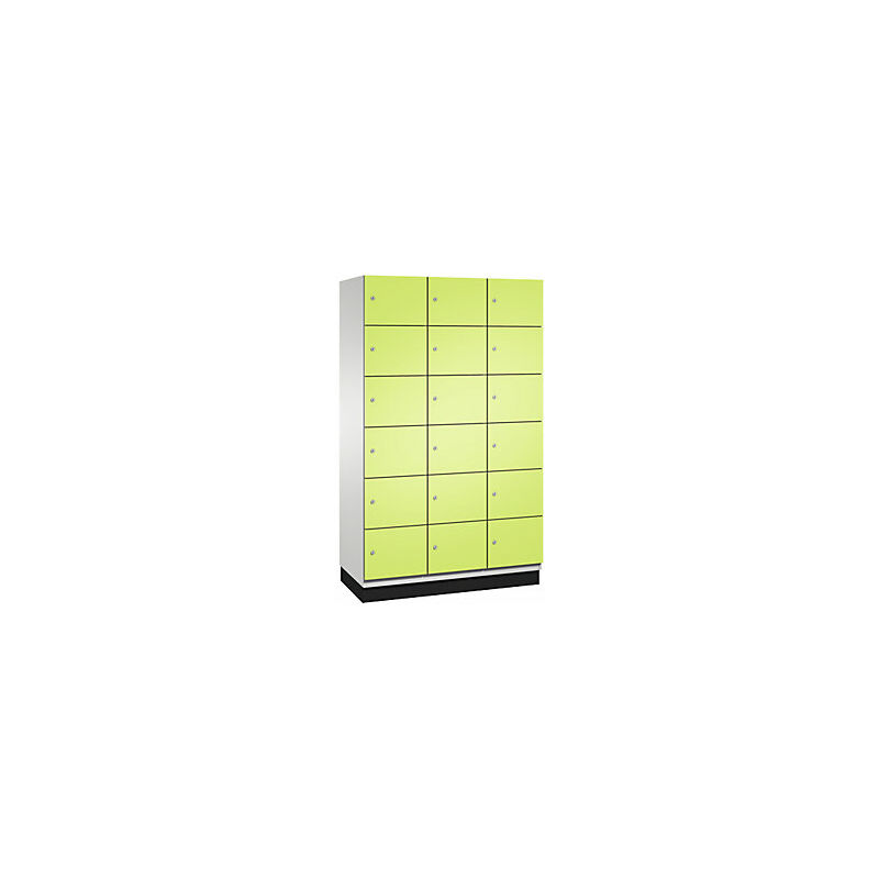 Armadietto a scomparti CAMBIO con porte in lamiera d'acciaio, 18 scomparti larghi 1200 mm, corpo grigio chiaro / anta verdino. Fornitura = montato. Altezza = 1950 mm. Profondità = 525 mm. Larghezza = 1200 mm. Colore corpo = grigio chiaro RAL 7035. Colore porta = verde azzurrognolo RDS 1108060. Serratura = serratura a cilindro differenziata. Numero scomparti in larghezza = 3 pz. Numero scomparti = 18 pz. Larghezza scomparti = 400 mm. Materiale = lamiera d'acciaio. Altezza armadietto = 1950 mm. Dotazione interna = senza dotazione interna. Larghezza interna = 362 mm. Altezza interna = 262 mm. Profondità interna = 480 mm. Tipo di porta = anta in lamiera piena. Numero chiavi = 2 pz. Altezza scomparti = 308.3 mm. Larghezza ripiani = 400 mm. Profondità ripiani = 525 mm. Altezza zoccolo = 100 mm. Struttura = con saldatura. Superficie = verniciatura. Struttura in acciaio di lunga durata con ante a battente in acciaio. Cerniere in alluminio/plastica. Finecorsa di apertura a 90°. Materiale corpo