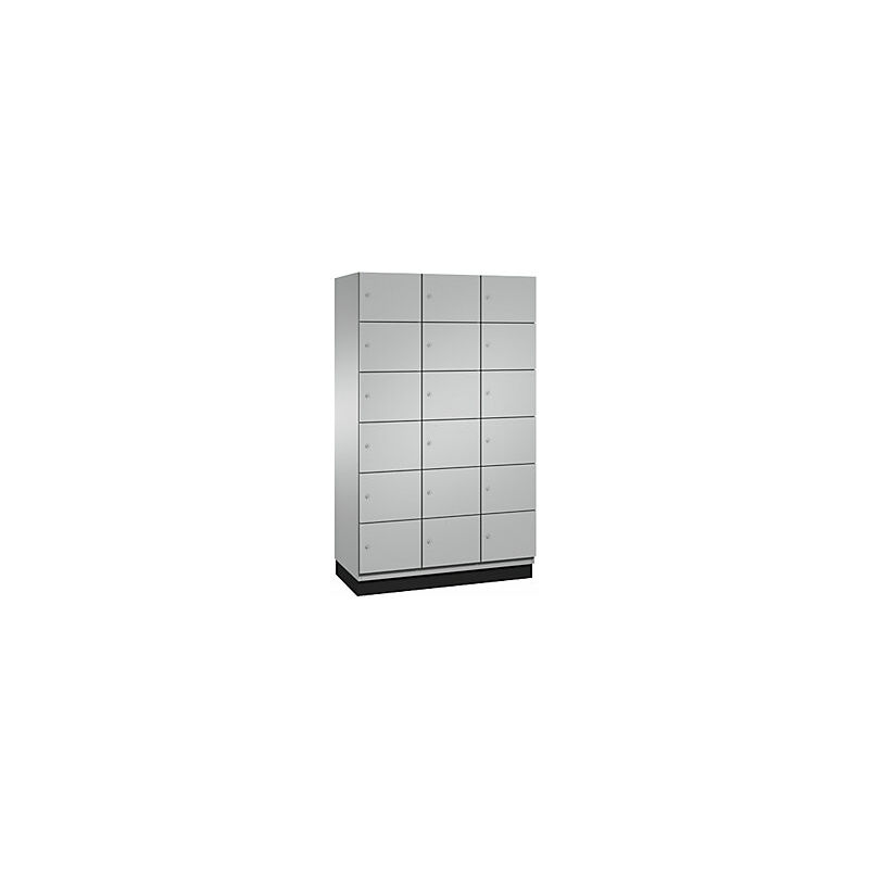 Armadietto a scomparti CAMBIO con porte in lamiera d'acciaio, 18 scomparti larghi 1200 mm, corpo alluminio brillante / anta alluminio brillante. Fornitura = montato. Altezza = 1950 mm. Profondità = 525 mm. Larghezza = 1200 mm. Colore corpo = alluminio brillante RAL 9006. Colore porta = alluminio brillante RAL 9006. Serratura = serratura a cilindro differenziata. Numero scomparti in larghezza = 3 pz. Numero scomparti = 18 pz. Larghezza scomparti = 400 mm. Materiale = lamiera d'acciaio. Altezza armadietto = 1950 mm. Dotazione interna = senza dotazione interna. Larghezza interna = 362 mm. Altezza interna = 262 mm. Profondità interna = 480 mm. Tipo di porta = anta in lamiera piena. Numero chiavi = 2 pz. Altezza scomparti = 308.3 mm. Larghezza ripiani = 400 mm. Profondità ripiani = 525 mm. Altezza zoccolo = 100 mm. Struttura = con saldatura. Superficie = verniciatura. Struttura in acciaio di lunga durata con ante a battente in acciaio. Cerniere in alluminio/plastica. Finecorsa di apertura a