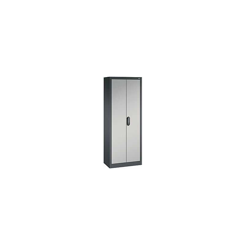 Armadio universale ACURADO, largh. x prof. 700 x 400 mm, grigio nerastro / alluminio brillante. Fornitura = montato. Larghezza = 700 mm. Altezza = 1950 mm. Profondità = 400 mm. Colore corpo = grigio nerastro RAL 7021. Materiale = acciaio, con verniciatura a forno. Tipo di prodotto = armadi con ante a battente. Tipo di porta = anta a battente. Colore porta = alluminio brillante RAL 9006. Numero ante = 2 pz. Numero ripiani = 4 pz. Materiale ripiani = lamiera d'acciaio. Colore ripiani = grigio chiaro RAL 7035. Portata per ripiano = 70 kg. Caratteristiche = con serratura. Serratura = Ergo-Lock, serratura a cilindro, con triplo chiavistello. Numero file raccoglitori = 5 pz. Dotazione interna = 4 ripiani. Passo di regolazione altezza ripiani = 15 mm. Altezza zoccolo = 100 mm. Angolo di apertura delle porte = 110 °. Spessore ripiani = 24 mm. Spessore del corpo = 0.88 mm. Spessore porta = 25 mm. Spessore parete posteriore = 0.75 mm. Robusta struttura in acciaio di lunga durata, corpo
