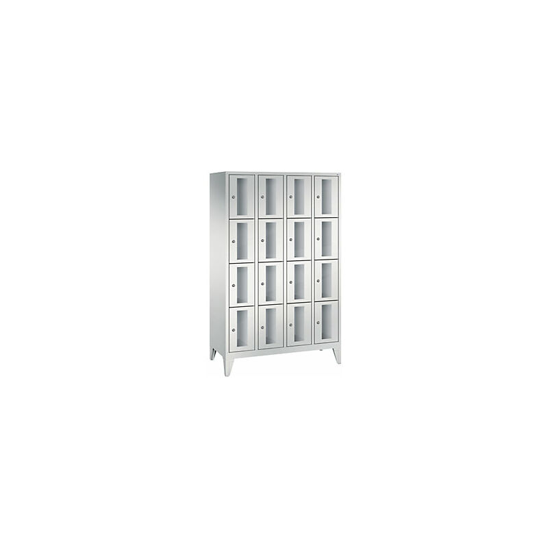 Armadietto a scomparti CLASSIC, altezza scomparti 375 mm, con piedini, 16 scomparti larghi 1190 mm, anta grigio chiaro. Fornitura = montato. Altezza = 1850 mm. Profondità = 500 mm. Larghezza = 1190 mm. Colore corpo = grigio chiaro RAL 7035. Colore porta = grigio chiaro RAL 7035. Serratura = serratura a cilindro differenziata. Numero scomparti in larghezza = 4 pz. Numero scomparti = 16 pz. Larghezza scomparti = 300 mm. Materiale = lamiera d'acciaio. Altezza armadietto = 1850 mm. Dotazione interna = senza dotazione interna. Larghezza interna = 230 mm. Altezza interna = 375 mm. Profondità interna = 465 mm. Tipo di porta = anta a battente. Numero chiavi = 2 pz. Altezza scomparti = 425 mm. Larghezza ripiani = 300 mm. Profondità ripiani = 500 mm. Altezza piedini = 150 mm. Struttura = con saldatura. Superficie = verniciatura. Struttura in acciaio di lunga durata. Finestrella in vetro acrilico spessa 3 mm. Visibilità diretta. Verniciatura a forno di qualità per elevata resistenza ai raggi UV e