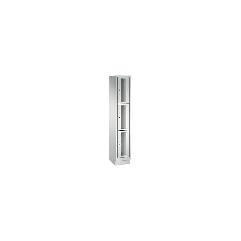 Armadietto a scomparti CLASSIC, altezza scomparti 510 mm, con zoccolino, 3 scomparti larghi 320 mm, anta grigio chiaro. Fornitura = montato. Altezza = 1800 mm. Profondità = 500 mm. Larghezza = 320 mm. Colore corpo = grigio chiaro RAL 7035. Colore porta = grigio chiaro RAL 7035. Serratura = serratura a cilindro differenziata. Numero scomparti = 3 pz. Materiale = lamiera d'acciaio. Dotazione interna = senza dotazione interna. Larghezza interna = 230 mm. Altezza interna = 510 mm. Profondità interna = 465 mm. Tipo di porta = anta a battente. Numero chiavi = 2 pz. Altezza scomparti = 510 mm. Altezza zoccolo = 100 mm. Struttura = con saldatura. Superficie = verniciatura. Struttura in acciaio di lunga durata. Finestrella in vetro acrilico spessa 3 mm. Visibilità diretta. Verniciatura a forno di qualità per elevata resistenza ai raggi UV e alla corrosione. Armadietto a scomparti in acciaio CLASSIC, corpo in robusta struttura di acciaio con verniciatura a forno di qualità per elevata resistenza