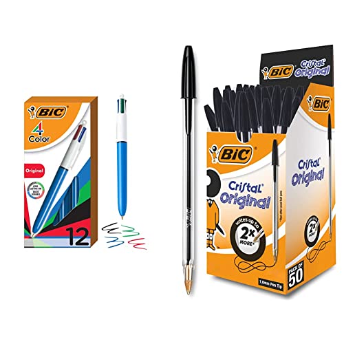 BIC 4Colori Original, Penne Multicolore a Sfera, Penne a Scatto con 4 Colori & Cristal Original, Penne Nere a Sfera, Punta Media (1.00 mm), Confezione 50 Penne Economiche